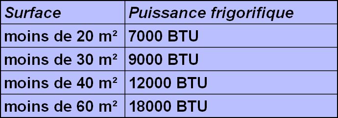 Ci-après un tableau de ratio faisant la correspondance entre la surface de la pièce et la puissance en BTU nécessaire.